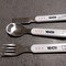 Estos cubiertos infantiles personalizados están hechos de acero inoxidable, y el mango, que es la parte que personalizamos con tus diseños, es de plástico blanco. Puedes diseñar tus cubiertos con el diseño, logotipo, nombre o texto que quieras, impreso sobre el mango. También ponemos a tu disposición diferentes plantillas prediseñadas que puedes adaptar y modificar fácilmente para obtener el modelo más exclusivo.