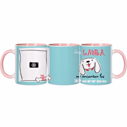 Una idea que le encanta a muchas dueñas y dueños de perros, es crear una taza personalizada donde aparezca la raza de su perro (ya sea con una ilustración, un diseño, un icono...) y añadir el nombre del perro en la taza, o incluso una foto si se desea.